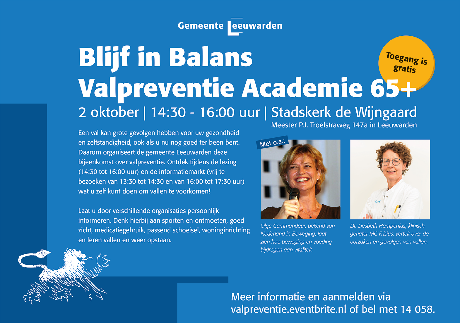 Daarom organiseert de gemeente Leeuwarden deze bijeenkomst over valpreventie. Ontdek tijdens de lezing (14:30 tot 16:00 uur) en de informatiemarkt (vrij te bezoeken van 13:30 tot 14:30 en van 16:00 tot 17:30 uur) wat u zelf kunt doen om vallen te voorkomen!